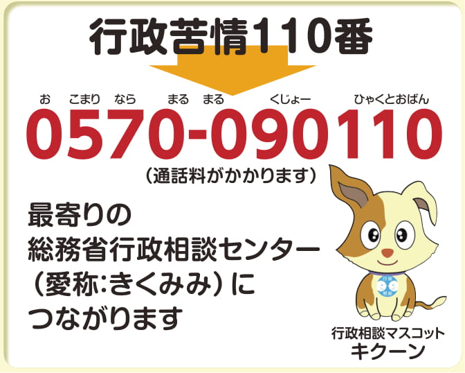 さらに次の窓口でも相談できます総務省行政相談センターきくみみ(総務省行政相談センターきくみみの連絡先一覧) ← クリックしてください。 総合行政相談所 全国主要都市のデパートなどで毎日または定期的に開設しています。 地域総合窓口 全国各地の主要な地域を巡回する方法により、国や都道府県・市町村の職員などと一緒になって、ワンストップで相談を受付け、処理しています。 (詳細は、最寄りの総務省行政相談センターにお問い合わせください。) インターネットで相談することもできますインターネットで相談される方は下のボタンをクリックしてください。